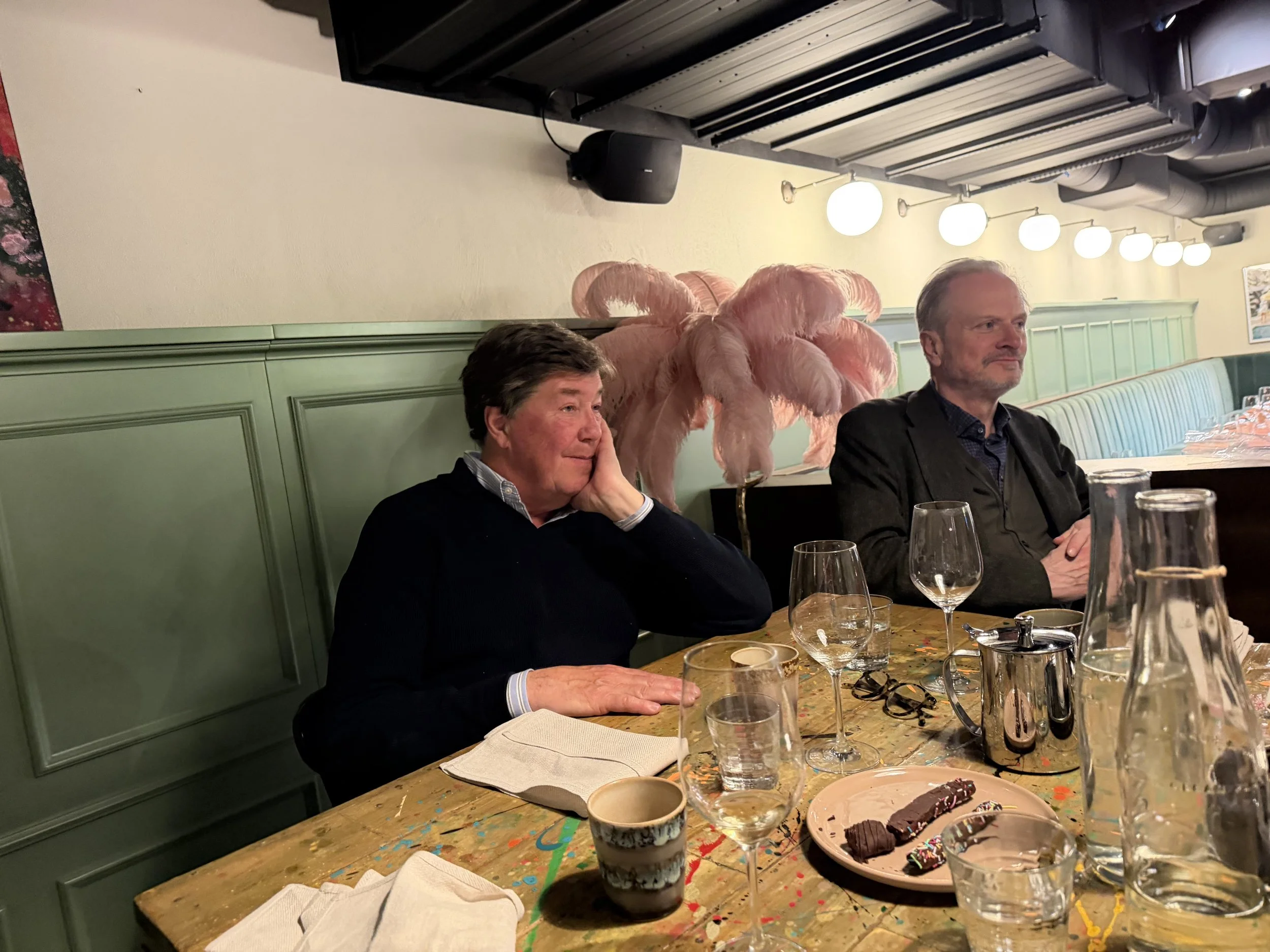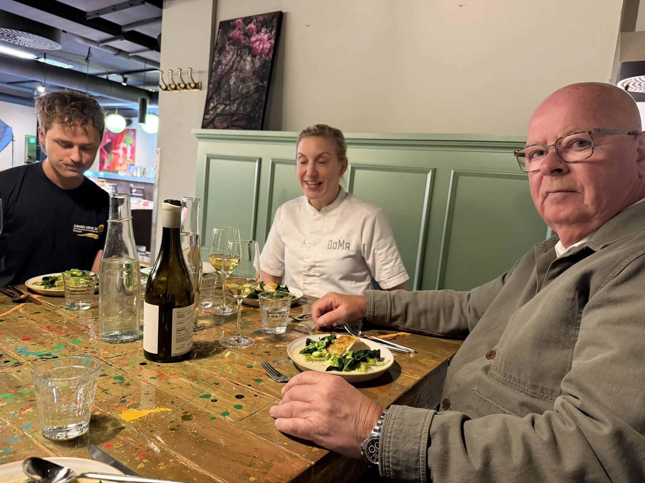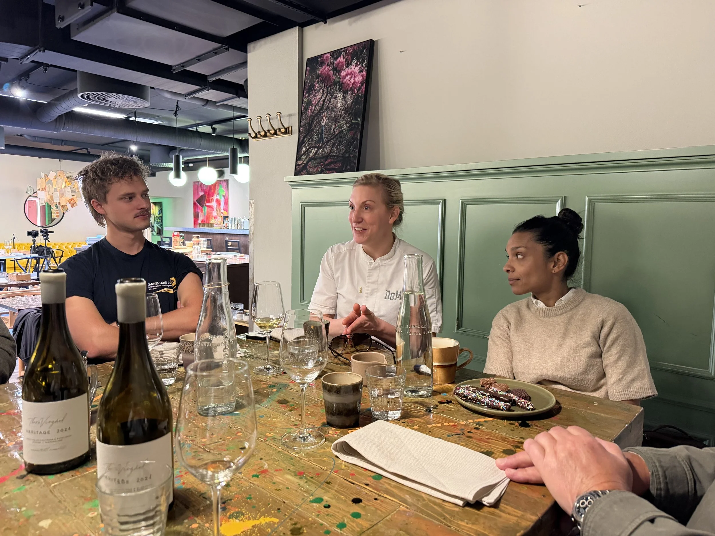 Härlig vårlunch på NoMa med första sparrisen från Gotland och Heritage 2024 från Thora Vingård på Bjärhalvön. Filmaren Pontus Klingeborn, cheffe Tea Malmegård och ständ. ordf. Severin Sjöstedt.