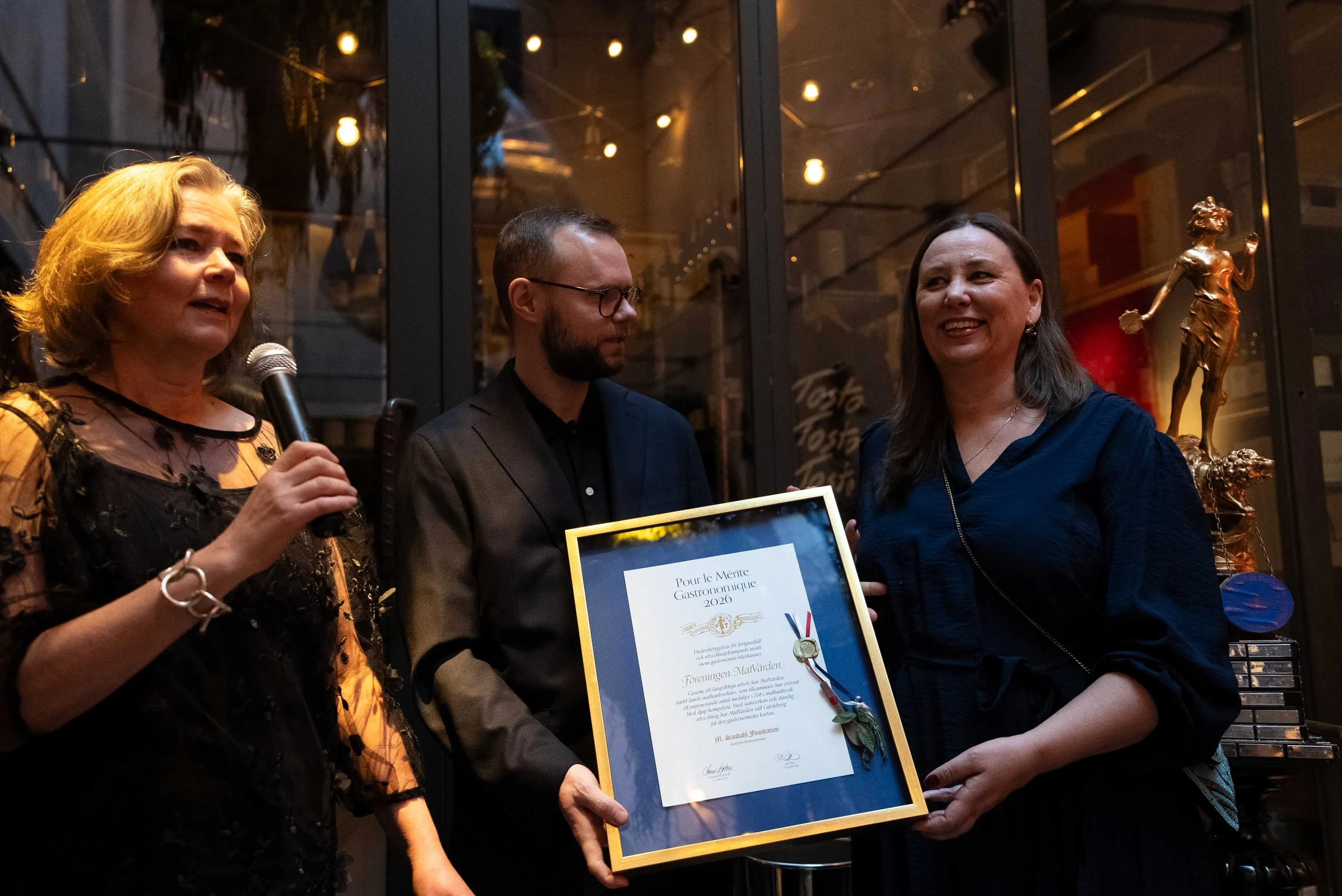 Fadder Malin Söderström med Diplomet Pour le Merite till föreningen MatVärden, Linda Elverstig och Daniel Coyet.