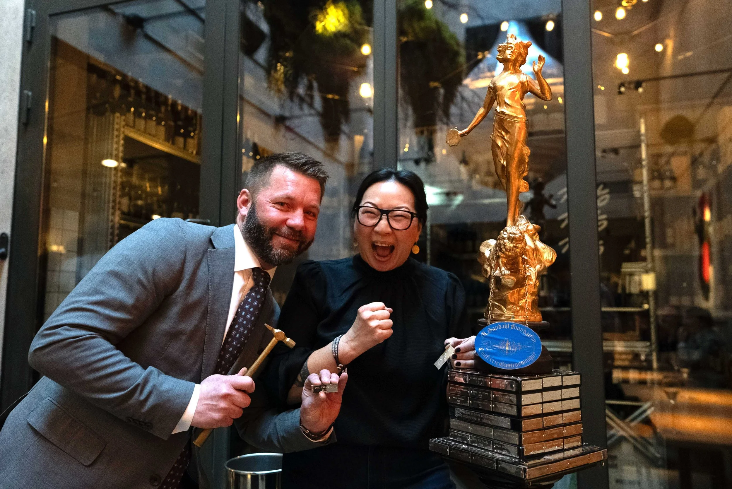I slutet av lunchen tackade de nyinvalda Emelie och Carl ”Je suis très honoré/heureux” enligt alla konstens regler och drack glatt Champagne Pol Roger 2018 ur den blå kalken.