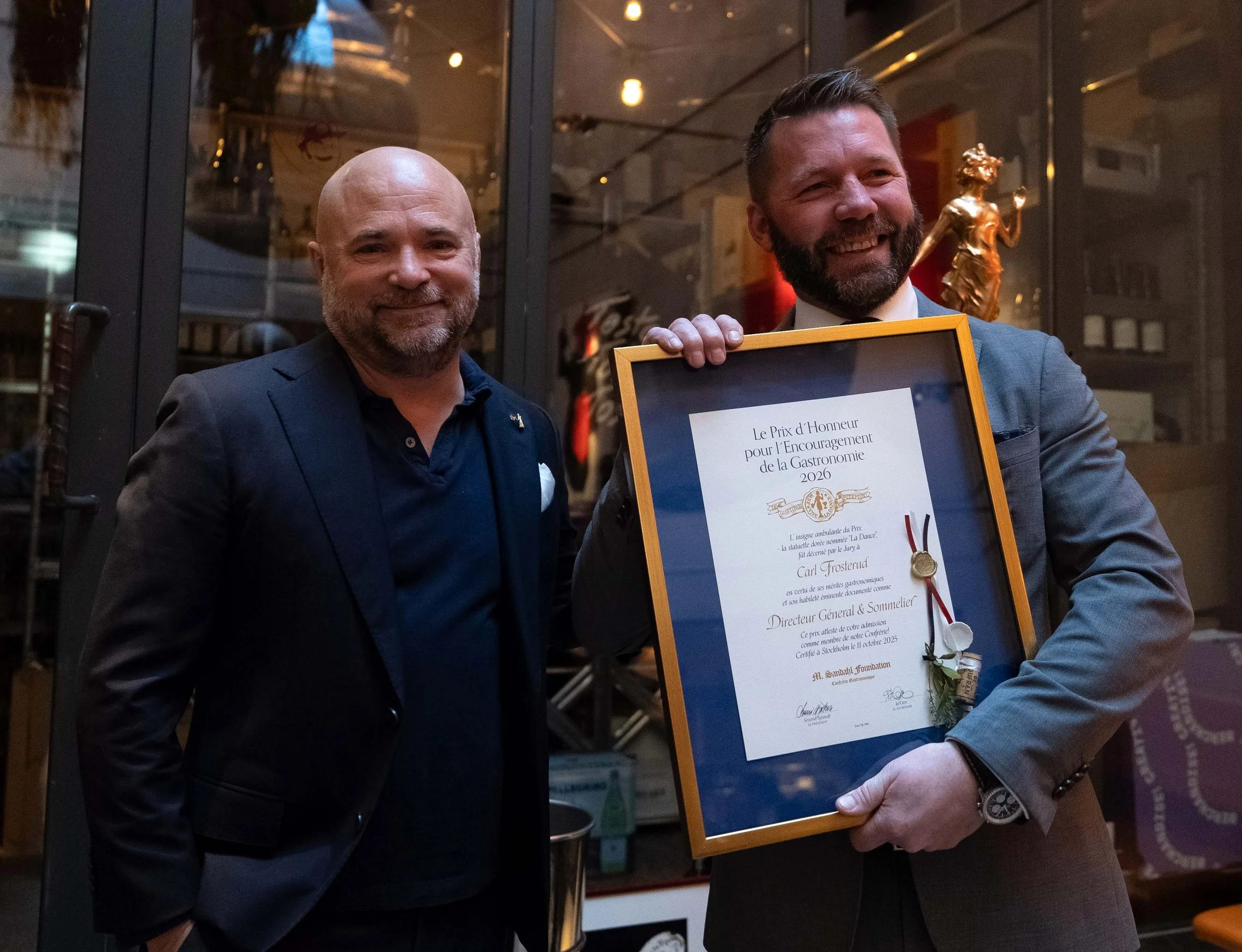 Carl Frosterud presenterades (Äntligen! Ropade församlingen) av sin fadder Karl Ljung som intygade att Carl är satans så bra på allt han gör. Elva år på Operakällaren*, Frantzén*** och nu AIRA**, Årets servitör fem gånger, Årets sommelier ett antal gånger… Carl får det svåra i en matsal att se så enkelt ut. Nu är också vinkulturen i Sandahl säkrad!